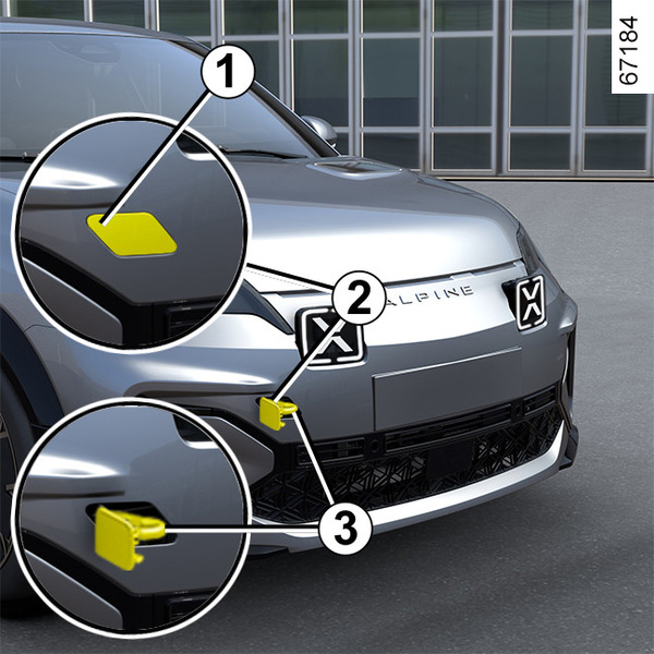 استخدم فقط نقطة السحب الأمامية 2 (لا تستخدم مطلقًا أعمدة التوجيه أو أي أجزاء أخرى بالسيارة). لا يجوز استخدام نقاط الجر هذه إلا للسحب. ويجب عدم استخدامها مطلقًا لرفع السيارة بشكل مباشر أو غير مباشر.