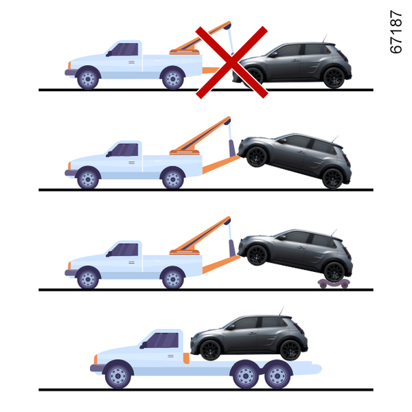 قبل سحب السيارة أو رفعها على منصة، حسب الحالة، تأكد من أن التحكم في التروس في الوضع N أو من تحرير فرامل الانتظار، أو كليهما.