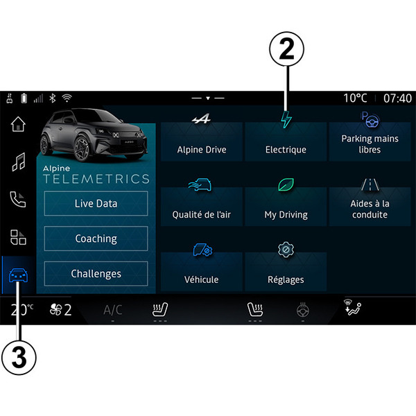 Drücken Sie bei stehendem Fahrzeug und laufendem Motor in der Themenwelt „Fahrzeug“ 3 auf dem Multimediabildschirm 1 und dann das Menü „Elektrisch“ 2, um den Fahrzeugkomfort und/oder Ihr Ladeprogramm zu konfigurieren.