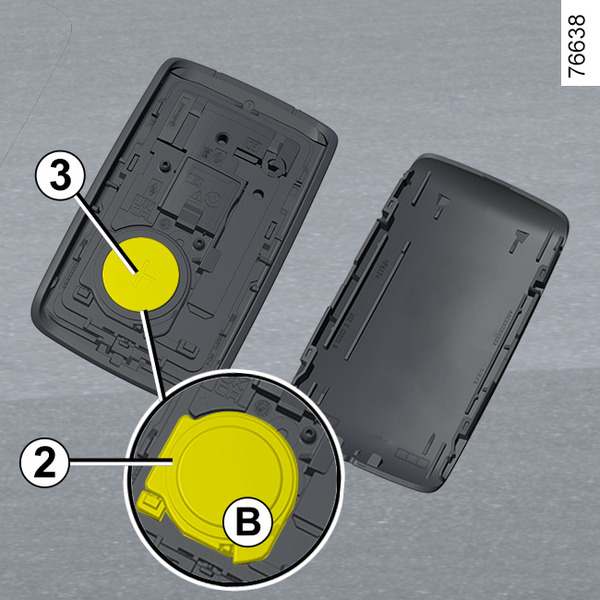 - en la zona B, extraiga la tapa 2 de la batería 3 levantándola hacia arriba;
