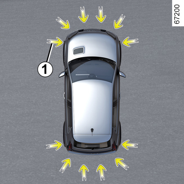 יש לוודא שהאזור מסביב לחיישנים הקוליים המצוינים באמצעות החצים 1 אינו חסום (בשל לכלוך, בוץ, שלג, לוחית רישוי המותקנת/מחוברת באופן לקוי), פגוע, עבר שינוי (כולל צביעה) או חסום בשל אביזרים שהותקנו בחלקו האחורי של הרכב ו/או, בהתאם לסוג הרכב, בחזית או בצדדים.