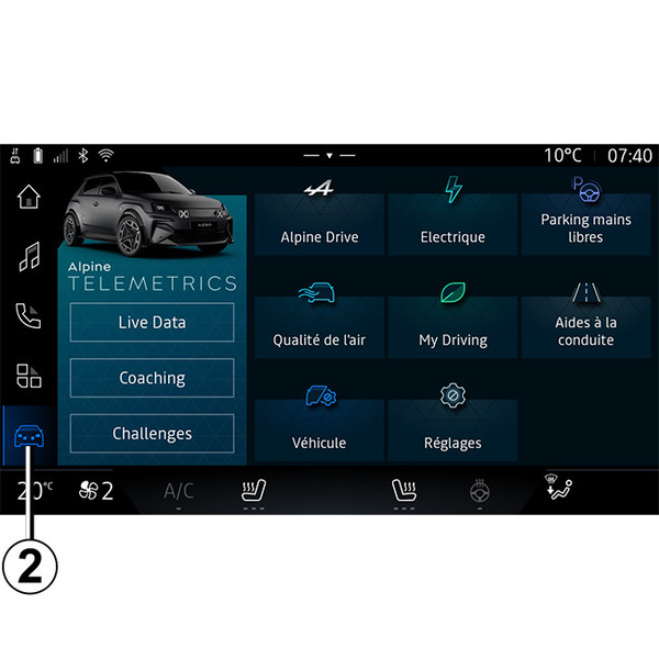 - ממסך מערכת המולטימדיה 3 ולאחר מכן מהעולם רכב 2, יש ללחוץ על התפריט עזרי נהיגה ולאחר מכן על הכרטיסייה חֲנָיָה כדי לעבור אל תפריט עזרי החניה;