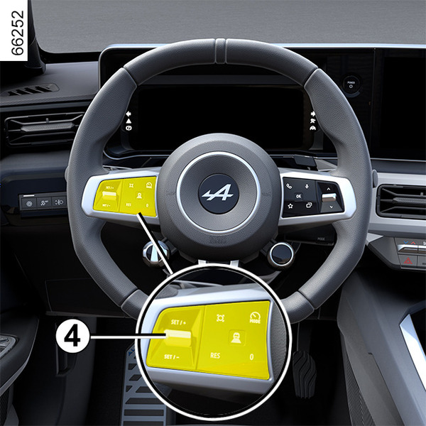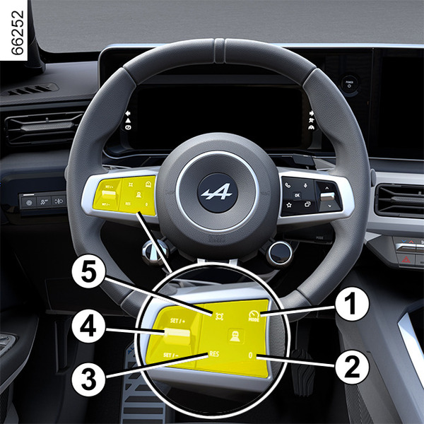 運転支援機能を OFF にするには、必要な回数だけスイッチ 1 を押します。「運転支援 解除」というメッセージがインストルメントパネル上に表示されます。