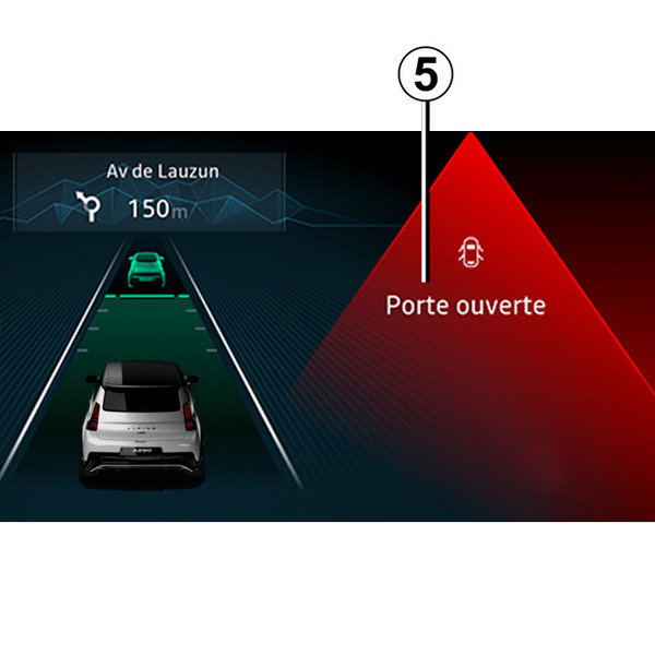 경고등 4가 "도어가 열려 있습니다" 메시지 5와 함께 어떤 도어가 열렸거나 잘못 닫혔는 지를 나타냅니다.