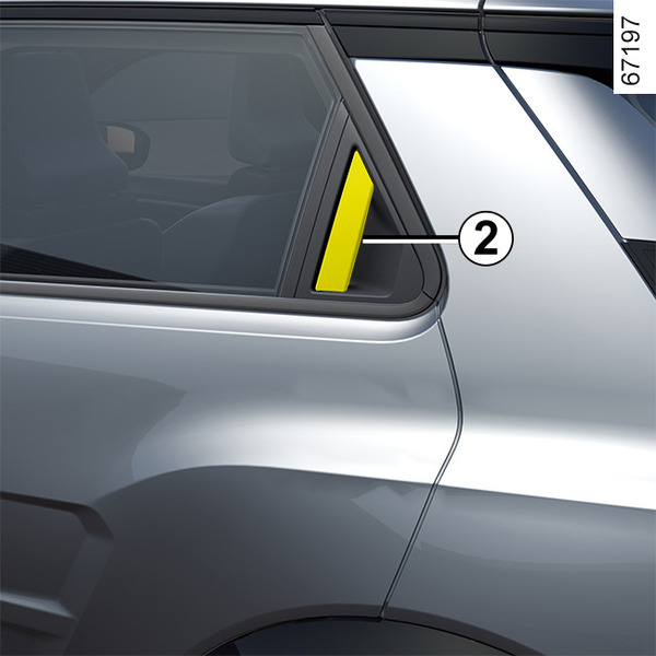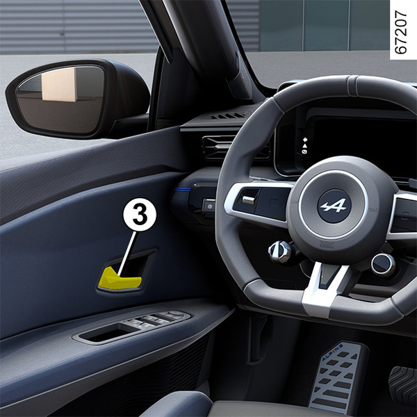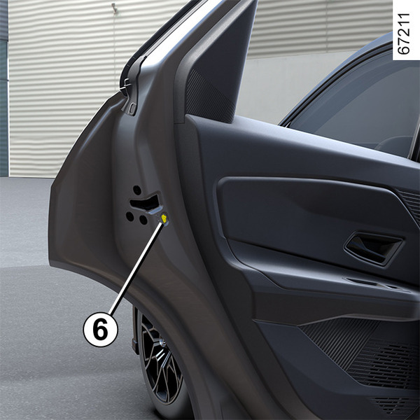 뒷좌석 도어를 내부에서 열 수 없도록 하려면 레버 6을 내리고 도어가 바르게 잠겼는지 내부에서 열어서 점검합니다.