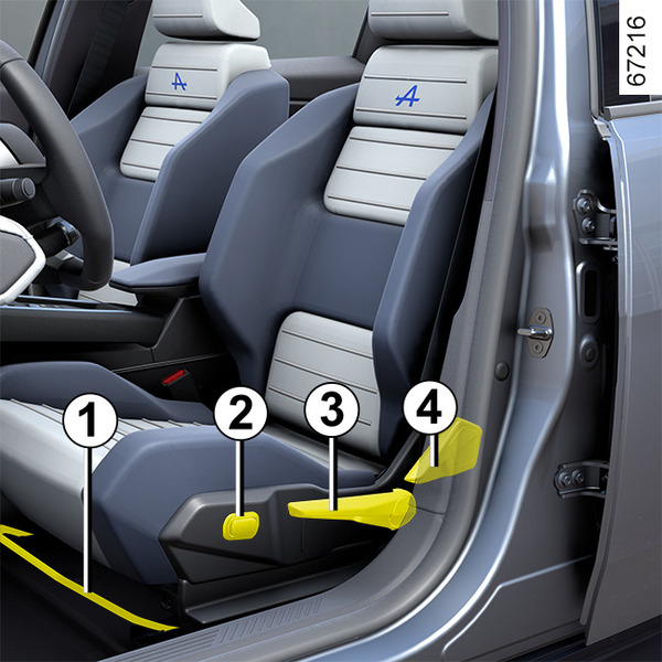 도어 핸들 4를 최대한 위로 올리고 등받이를 원하는 위치까지 기울입니다. 원하는 위치에서 핸들을 놓고 시트가 움직이지 않는지 확인하십시오.