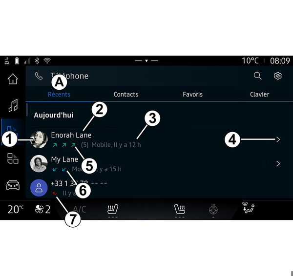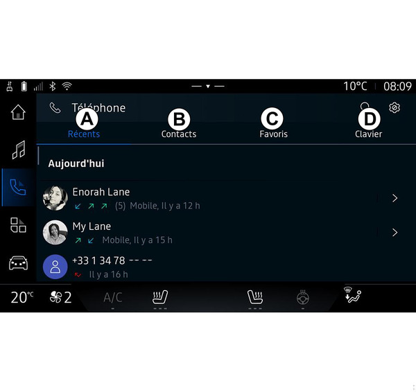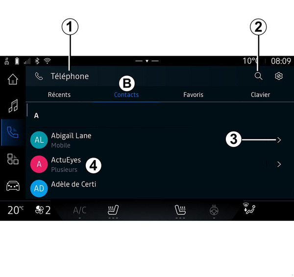 에서 "연락처" 탭 B를 눌러 멀티미디어 시스템을 통해 스마트폰의 전화번호부에 액세스합니다.