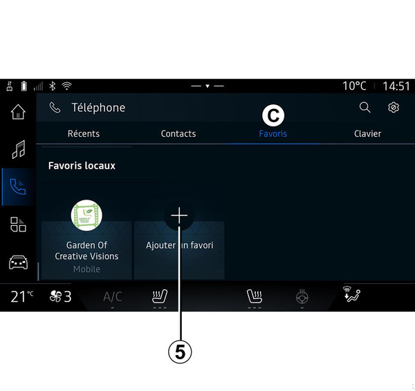 에서 "즐겨찾기" 탭 C를 눌러서 스마트폰의 즐겨찾기에 저장된 연락처에 액세스하거나 멀티미디어 시스템의 "연락처"목록에서 수동으로 연락처를 추가합니다.