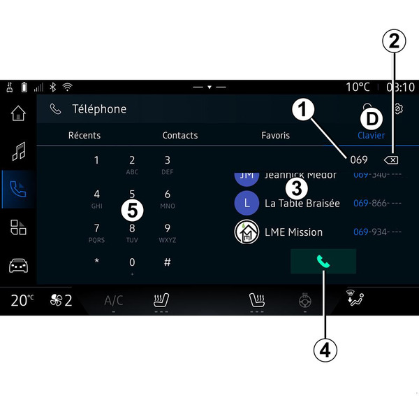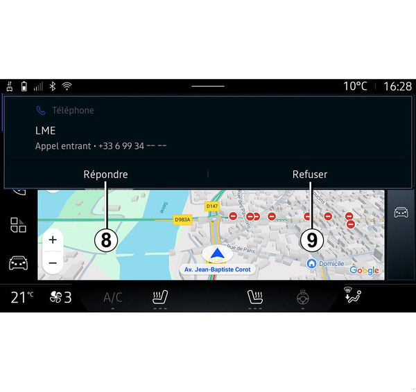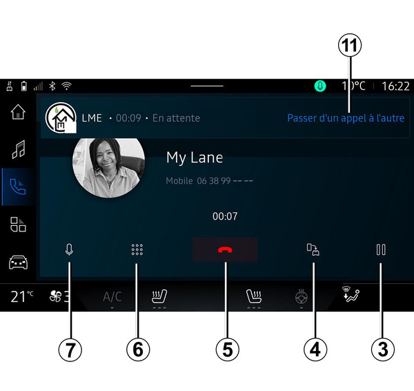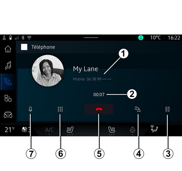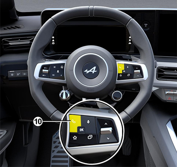 진행 중인 통화를 종료하려면 스티어링 휠의 컨트롤 10 또는 멀티미디어 시스템 화면의 "통화 종료" 버튼 5를 눌러 전화를 끊습니다.