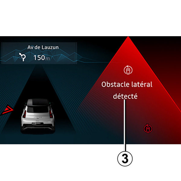 감지된 물체가 매우 가까이 있으면 신호음이 울리면서 계기판에 3 "측방장애물감지 차로확인하십시오" 경고 메시지가 표시됩니다.