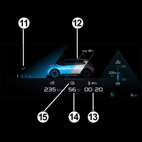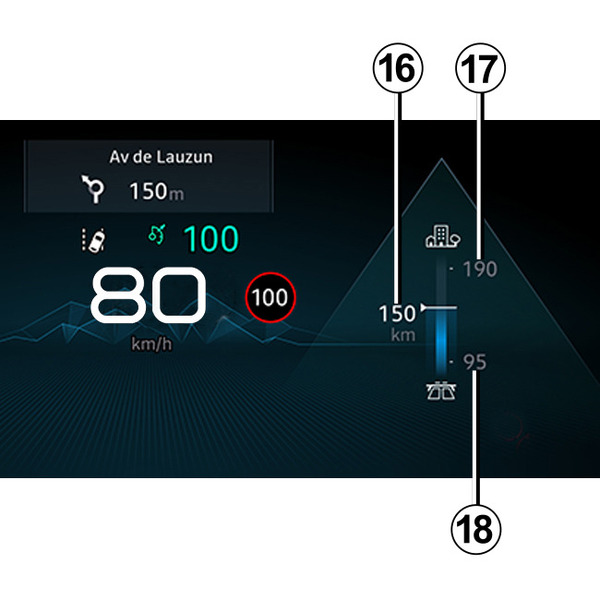 - 표시등 18: 불리한 주행 조건(예: 난방 시스템을 집중적으로 사용하는 겨울철 또는 교통 체증 속에서 고속도로 주행)에 따라 계산된 "낮음" 충전 수준에서의 주행 가능 거리.