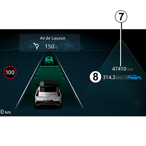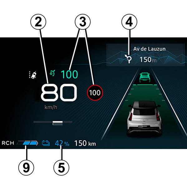 - 내비게이션 뷰: 속도, 액티브 주행 보조 장치 및 정보 영역을 계기판에 표시합니다. 또한 멀티미디어 시스템의 도로 지도를 전체 계기판에 복제하기도 합니다.