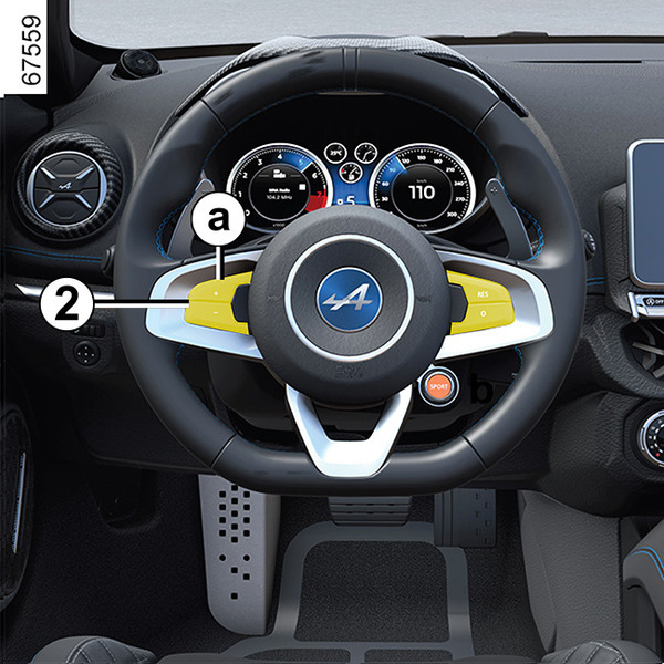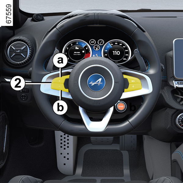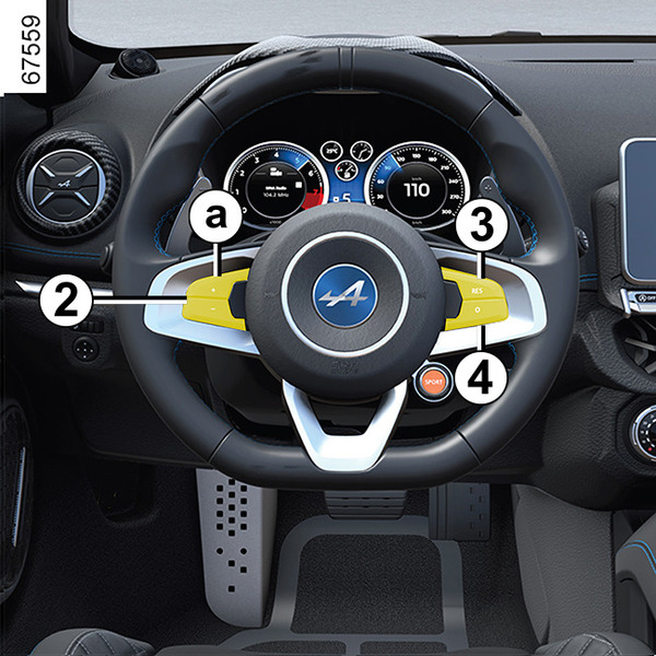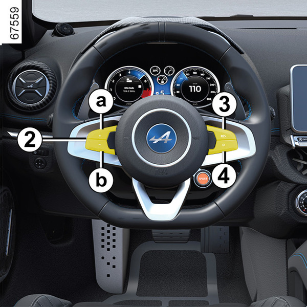 일정한 속도(약 30km/h 이상)에서 a(+) 부분의 스위치 2을 누르면 기능이 활성화되고 현재 속도가 저장됩니다.