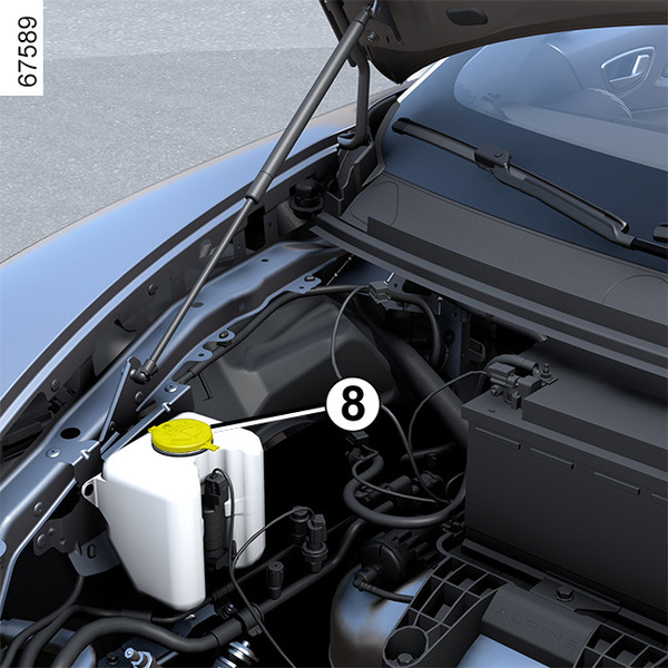 Izslēdziet dzinēju un atveriet vāciņu 8. Piepildiet šķidrumu un aizveriet vāciņu.