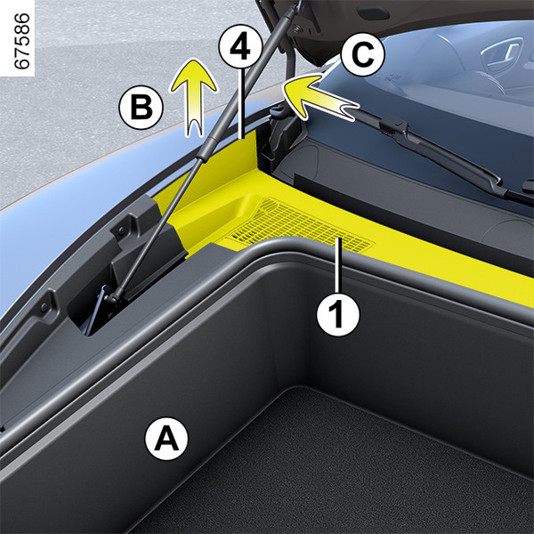 - satveriet spārna 4 aizmugurējo galu lūkas paneļa režģa renei 1 un velciet to augšup, lai atbrīvotu no lūkas paneļa režģa 2;