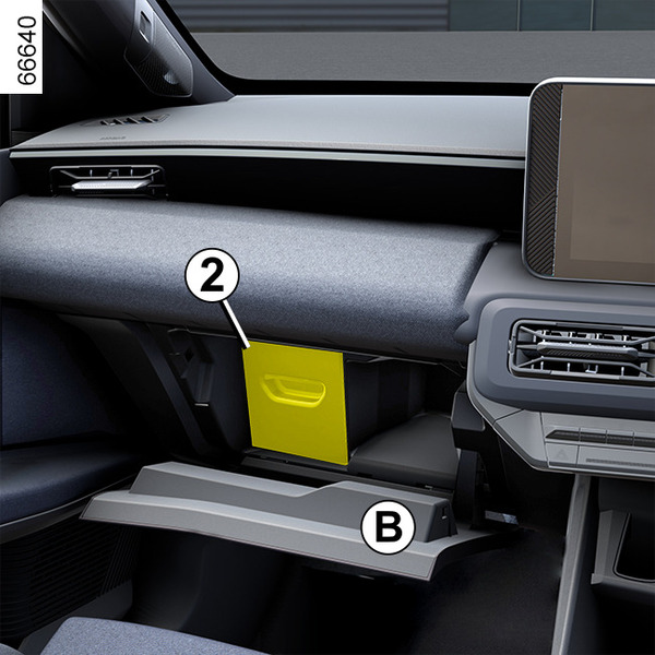 Drošinātājiem var piekļūt aiz cimdu kastes pasažieru salonā B. Atveriet cimdu nodalījumu, izmantojot atvēršanas pogu.