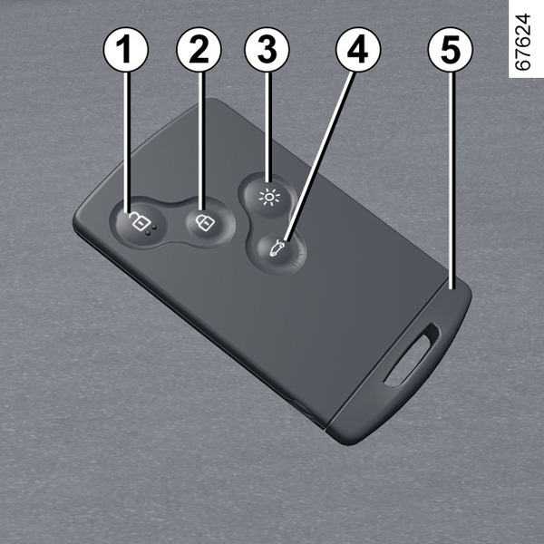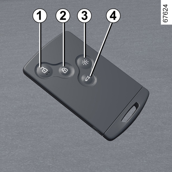 Låsing/opplåsing av åpningselementene og dørene <?xml version="1.0" standalone="yes"?>Låse / låse opp dørene fra utsidenDette gjøres ved hjelp av kortet Kart.I noen tilfeller kan det hende at kortet ikke fungerer:hvis batteriet til kortet er utladet, flatt osv.bruk av apparater som opererer på samme frekvens som kortet (mobiltelefon osv.)kjøretøyet befinner seg i et område med høy elektromagnetisk strålingDet er da mulig å: Kapittel