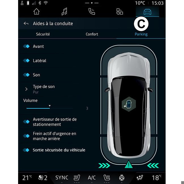 op het menu "Rijondersteuning" en vervolgens op het tabblad "Parkeren" C. Dit menu bevat de instellingen voor Parkeerhulp. Zie voor meer informatie de paragraaf "Parkeerhulp" in het instructieboekje van uw auto.