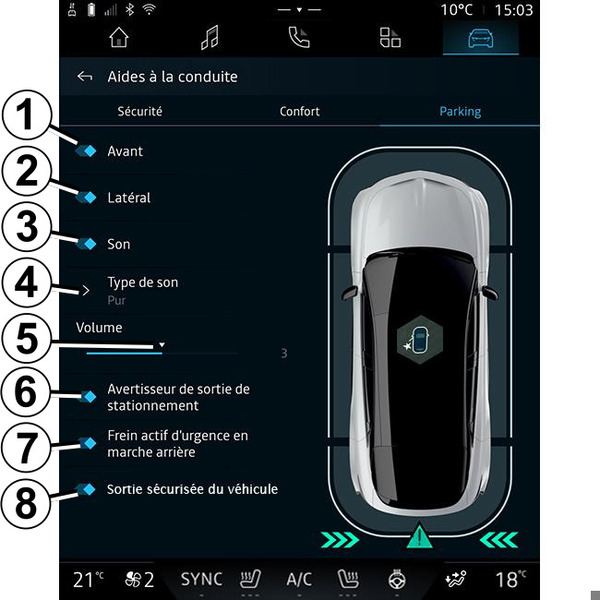 op het menu "Rijondersteuning" en vervolgens op het tabblad "Parkeren" om het menu Parkeerhulp te openen.