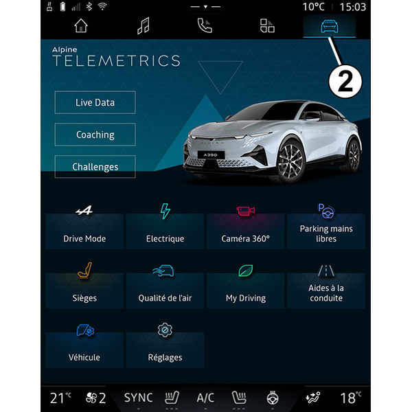 - ga op het multimediascherm 3 naar de wereld "Voertuig" 2 en druk op het menu "Rijondersteuning" en vervolgens op het tabblad "Parkeren" om toegang te krijgen tot het menu Parkeerhulpmiddelen;