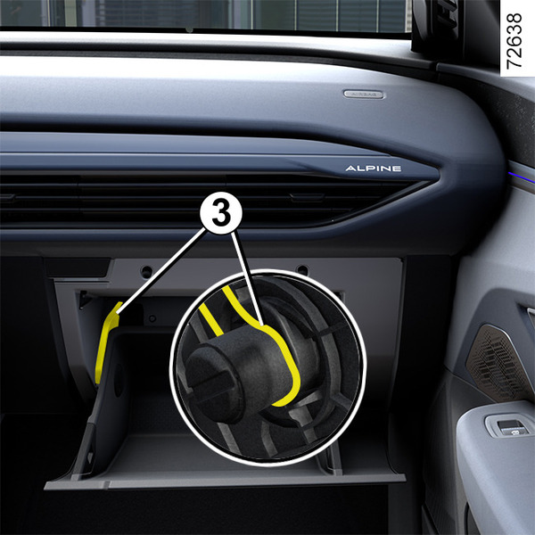 Odczep linkę 3, aby odblokować klapkę schowka w celu uzyskania dostępu do skrzynki bezpieczników.