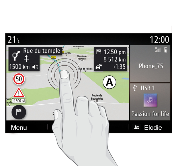 From most system menus you can access a pop-up menu 4 that gives access to sub-menus (delete favourites, change current route, settings, etc.) and to the user manual for your multimedia system.
