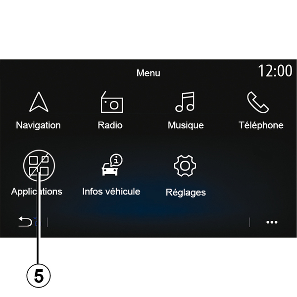 - "Settings": manage some vehicle equipment such as the reversing camera and adjust various settings on the multimedia system, such as the display, language, etc.;