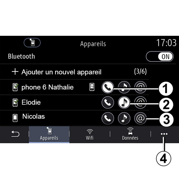 To access your phone's music, phonebook and internet connection directly via the multimedia system, you will need to authorise data sharing using the "Phone" menu, then the pop-up menu, "Paired devices listBluetooth®".