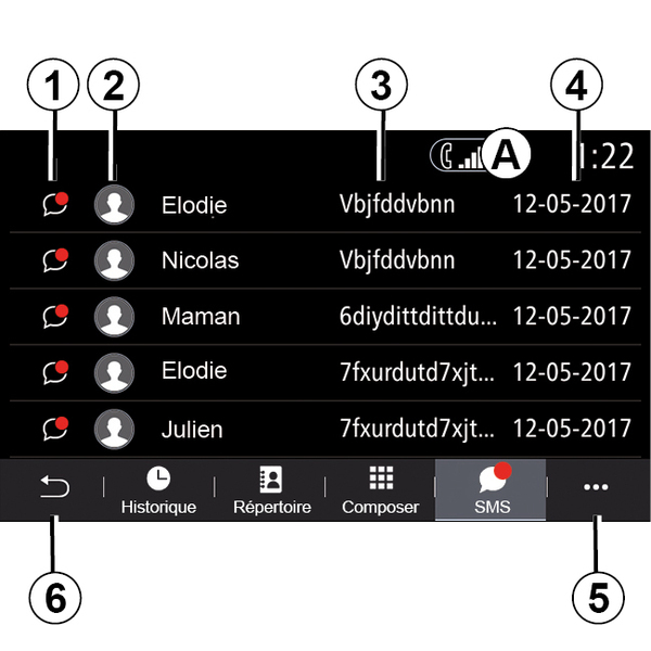During driving, the SMS can be read by the multimedia system's synthetic voice by pressing "Play" 7 or you can return the contact's call by pressing the "Call" button 10.