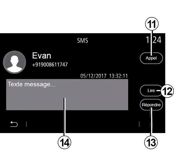 You can make the multimedia system's synthetic voice read out the SMS message in zone 14 by pressing the "Play" button 12, or reply by pressing the button 13.