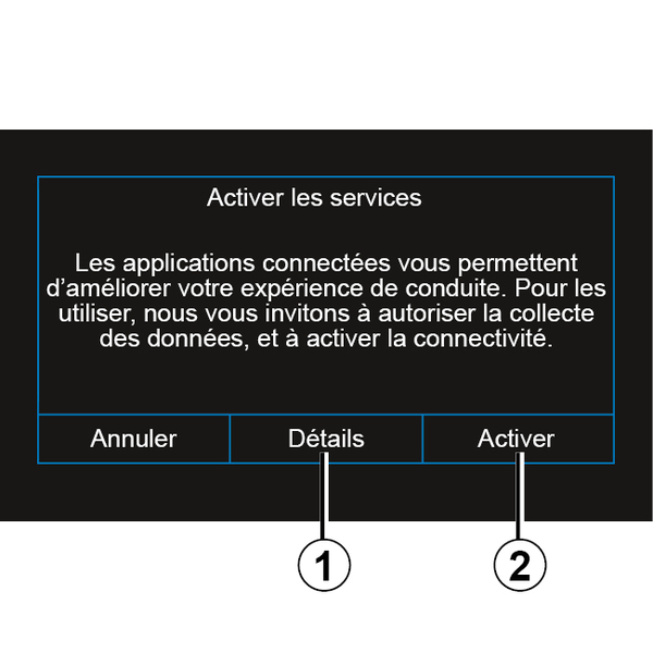 If the connected services are not yet activated, the multimedia system suggests that you send the activation request to the server by pressing "Connection", then confirm the request by pressing "Activate" 2.