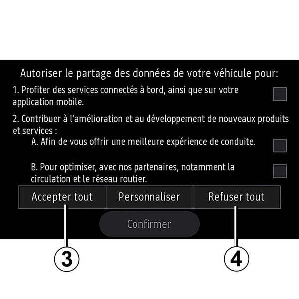The multimedia system suggests that you activate data collection. Press "Accept all" 3 to activate or "Refuse all" 4 to deactivate data collection.