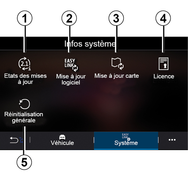 Use this menu to display various items of information and to update the multimedia system and navigation maps.