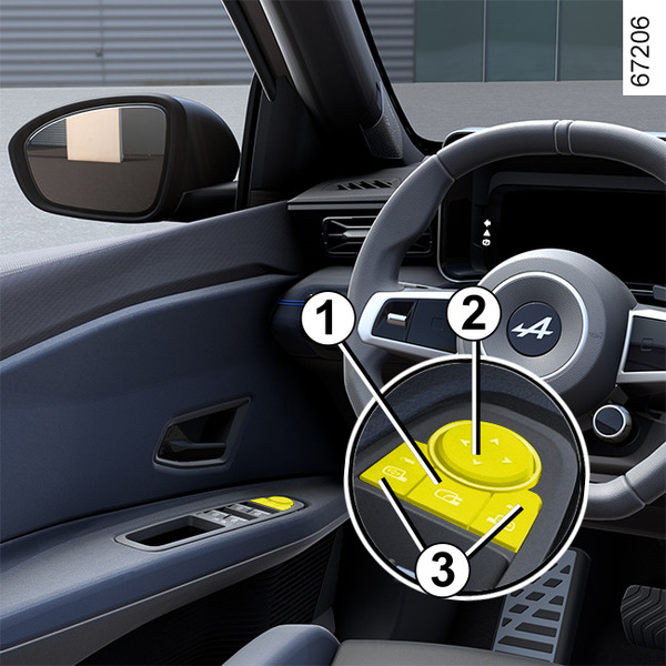 When you select a door mirror using one of the switches 3, the indicator light built into the switch will appear. Then use the button 2 to adjust it to the desired position.