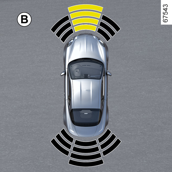 The area where the obstacle has been detected is displayed (display B). Depending on the vehicle, the area is displayed in green, orange or red, depending on the proximity of the detected obstacle.