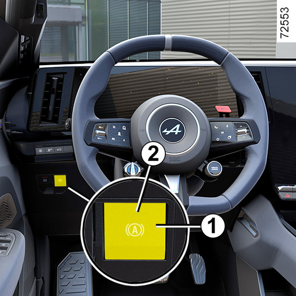O travão de estacionamento assistido pode ser utilizado para imobilizar o veículo. Antes de abandonar o veículo, verifique se o travão de estacionamento assistido está efetivamente acionado. O testemunho acende-se no interruptor 2 e o testemunho