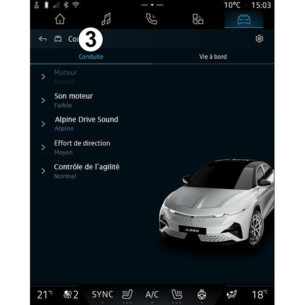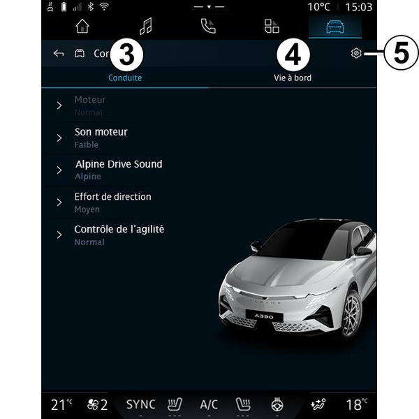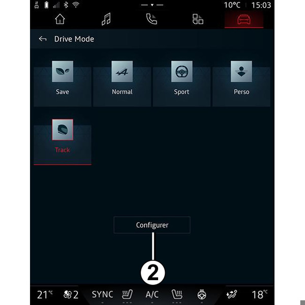 Selecione o modo pretendido e, em seguida, prima "Configurar" 2 para personalizar os diversos parâmetros dos seguintes sistemas de bordo: