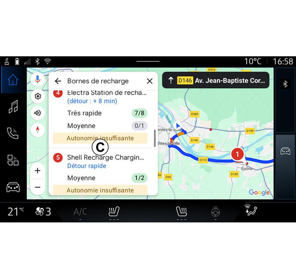 Dacă sunt necesare mai mult de o încărcare pentru a ajunge la destinaţie, o combinaţie optimizată de staţii de încărcare este calculată automat de sistemul multimedia pentru a menţine traseul total la un nivel minim.