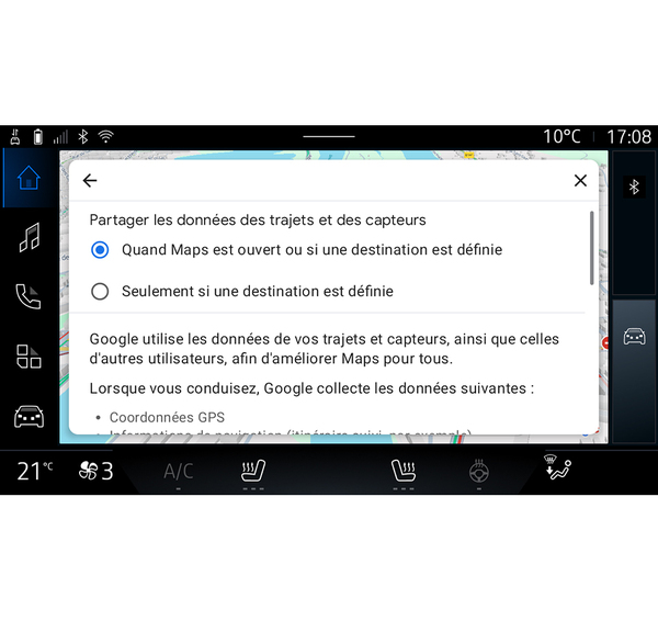 Datele dvs. de conducere şi locaţie pot fi partajate cu Google®. Acestea pot fi utilizate pentru a îmbunătăţi informaţiile furnizate de Google® pentru dvs. şi pentru alţi utilizatori, cum ar fi navigarea, condiţiile de trafic în timp real, disponibilitatea "hărţilor offline" etc.
