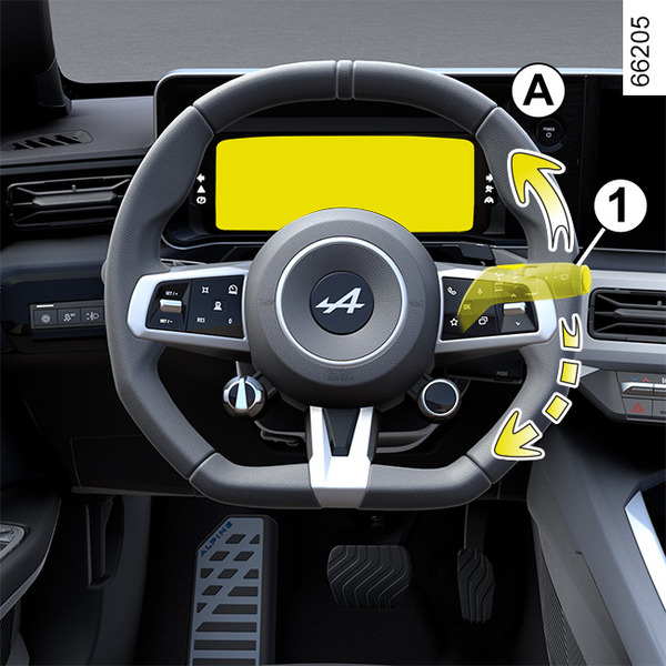 Pentru a readuce lamelele în poziţia joasă, asiguraţi-vă că lamelele sunt pliate pe parbriz, apoi treceţi maneta 1 în poziţia A (un singur baleiaj): lamelele ştergătoarelor de geam se pliază în capotă la punerea contactului.