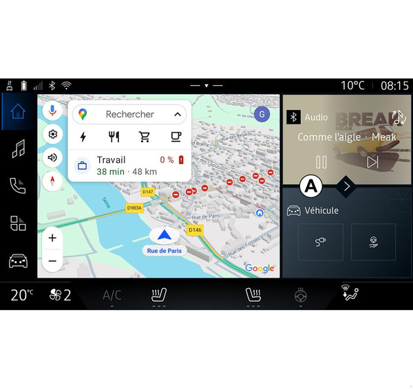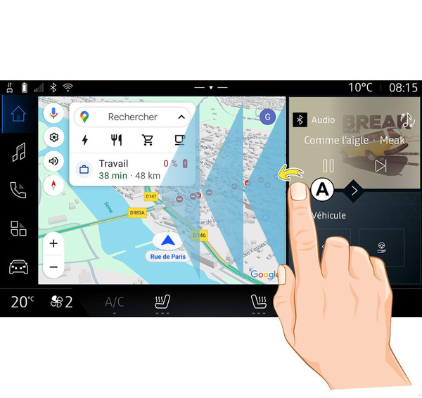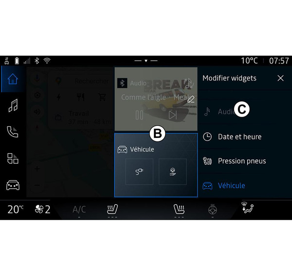 Systém obsahuje prispôsobiteľnú stránku „Navigácia“. Skladá sa z určitého počtu miniaplikácií v oblasti A, ktoré umožňujú prístup k informáciám a funkciám, akými sú rádio, tlak vzduchu v pneumatikách atď.