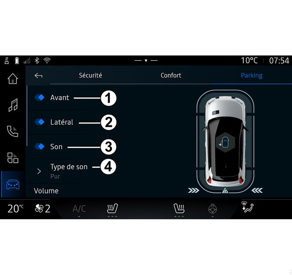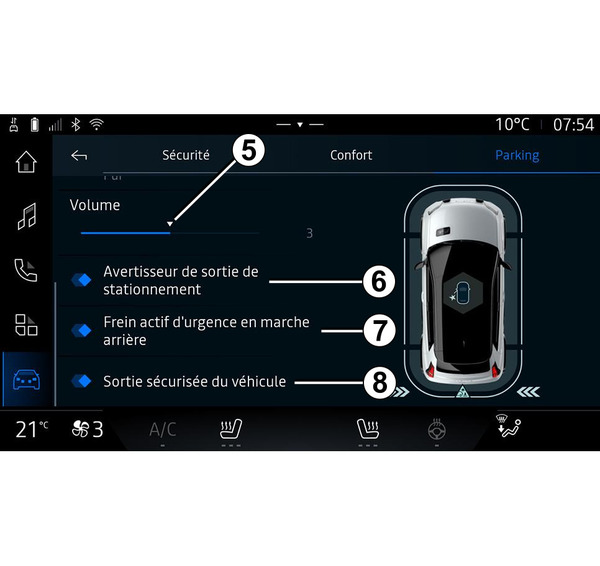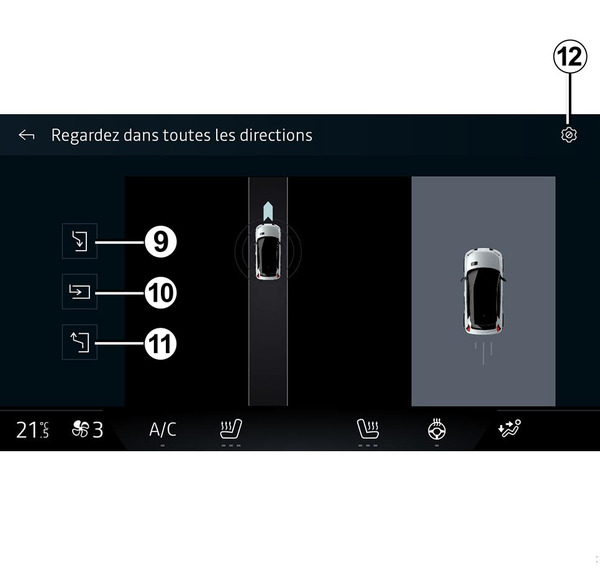 stlačte menu „Asistent jazdy“ a potom vyberte kartu „Parkovisko“ C; - miniaplikácie „Hands-free parkovací asistent“ stlačením tlačidla „Otvoriť“ (konfigurácia je opísaná v časti „Pridávanie a správa miniaplikácií“) Pridanie a riadenie pomôcok;
