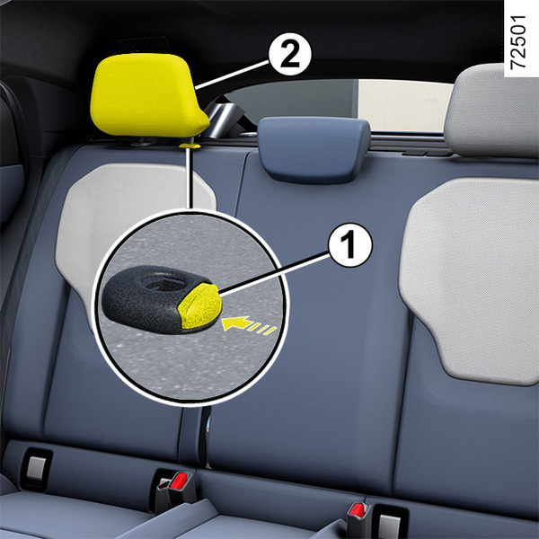 Sedežno klop nagnite naprej, nato pa pritisnite gumb 1 in odstranite vzglavnik 2.