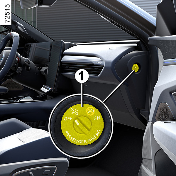 För att återaktivera airbag: med bilen stillastående och tändningen av, tryck in och vrid låset 1 till läget ON.