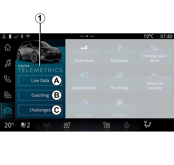 Tryck på fliken "Live Data" A, godkänn sedan användarvillkoren och ge tillstånd till tjänsten Alpine Telemetrics genom att följa instruktionerna som visas på multimediaskärmen.