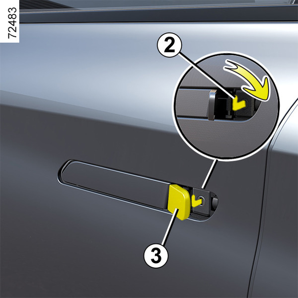 Flytta låsskyddet 3 genom att trycka på den vänstra delen och sätta in nyckeln 2 i låset för att låsa eller låsa upp förardörren.
