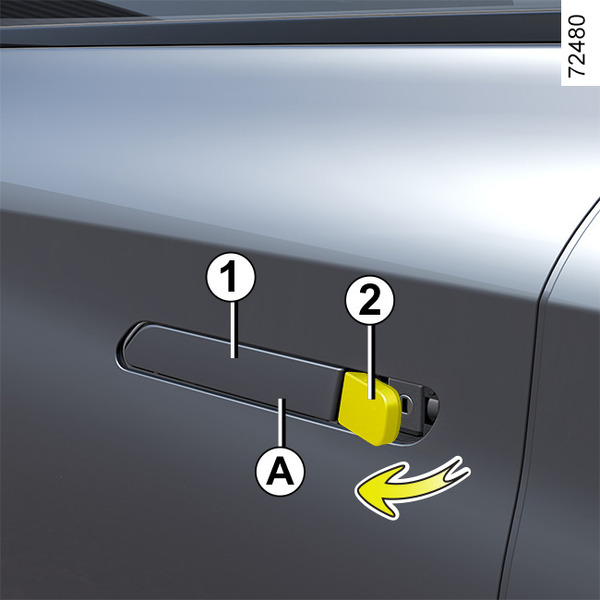 Handtaget kan fällas ut både manuellt och elektriskt. För att göra det manuellt flyttar du låskåpan 2 och tar tag i änden A av handtaget 1 med fingrarna.