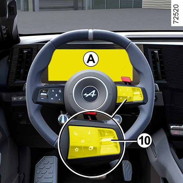 Beroende på bilmodell kan flera vyer vara tillgängliga på instrumentpanelen. För att välja en vy, tryck så många gånger som behövs på reglaget 1 för att bläddra genom de olika vyerna på instrumentpanelen A tills du kommer till önskad vy.