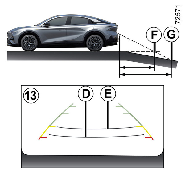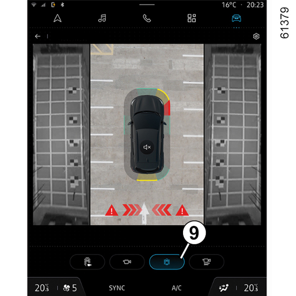 När systemet är aktiverat och funktionen "Parkeringsassistans" upptäcker ett eller flera hinder runt bilen visas linjerna 12 på de olika vyerna.