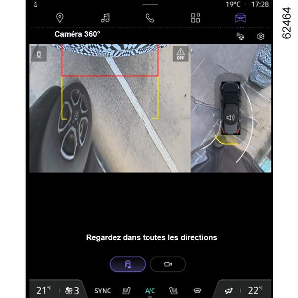 Tryck på den dedikerade knappen 9 på multimediaskärmen för att visa en vy som kombinerar fågelperspektiv och två sidovyer.